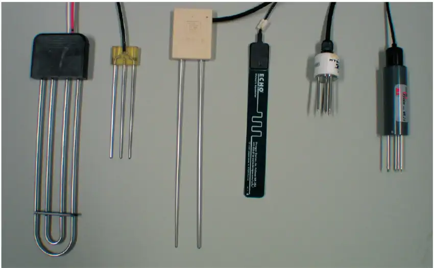- TDR (Elektromagnetische Reflexionszeit) Sensor: Er basiert auf dem Prinzip, elektromagnetische Signale von einer Quelle entlang zweier oder dreier im Boden platzierter Sonden zu senden. Das Signal erfolgt in Form einer einzelnen Bewegung (Schlag, Impuls). Diese elektromagnetischen Wellen wandern entlang der Sonden, die Signale treffen mit den Sonden auf den Boden und kehren als Reflexion zur Quelle zurück. Der von dieser elektromagnetischen Welle entlang der Sondenlänge zurückgelegte Weg und die Zeit, die sie benötigt, um zur Quelle zurückzukehren, werden gemessen. Mehr Wasser im Boden führt zu höheren dielektrischen Stärken (langsamere Übertragungsgeschwindigkeit).