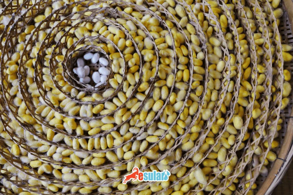 4. 蚕茧采集:茧形成后,在不破坏其完整性的情况下被仔细收集。这一过程通常由手工完成,并精心操作以保持茧的完整性。