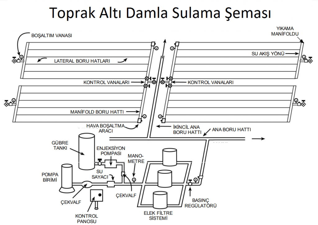 When creating a subsurface drip irrigation system diagram, it is important to pay attention to the preparation phase of the project. There is some important information that needs to be known at this stage. First, the location, position, and slope status of the land where the system will be installed must be determined. In addition, determining the water source location and type, understanding the physical structure of the soil, determining the plant species to be grown, and the inter-row and intra-row distances should be considered at this stage.