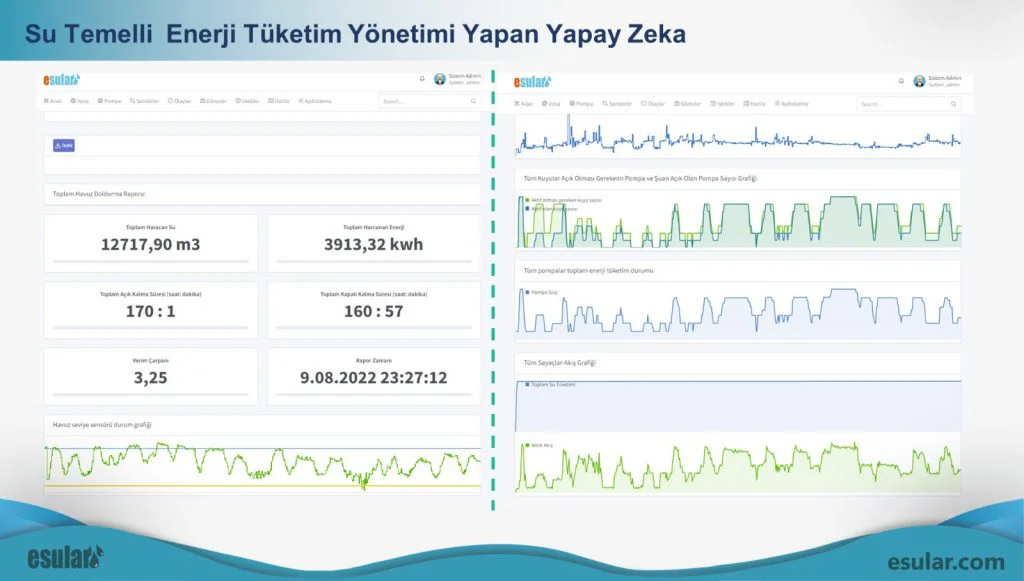 As Esular, thanks to our advanced software and artificial intelligence technologies, we provide maximum efficiency for energy and water optimization. We continuously monitor and interpret critical data such as flows, pressures, and water usage amounts, and manage well filling processes in the most efficient way with this data. Our AI-powered water-based energy consumption management software helps you reduce your energy consumption by more than 30% while ensuring you use your water resources in the most efficient way.