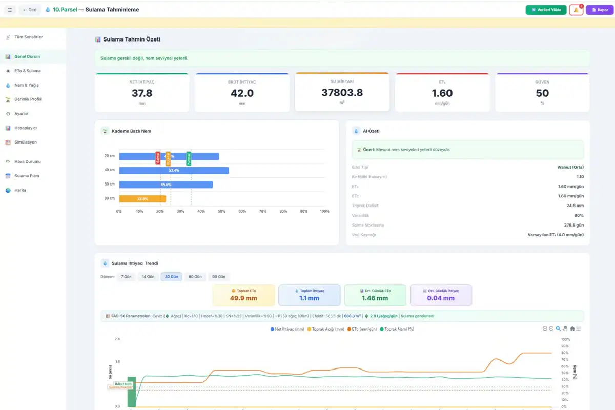 - Sulama Aralığı: Topraktaki RAW (kolayca kullanılabilir su) miktarının günlük ETc değerine bölünmesiyle, kaç günde bir sulama yapılması gerektiği hesaplanır. (Örn: Tınlı toprakta ceviz için ~8 günde bir).