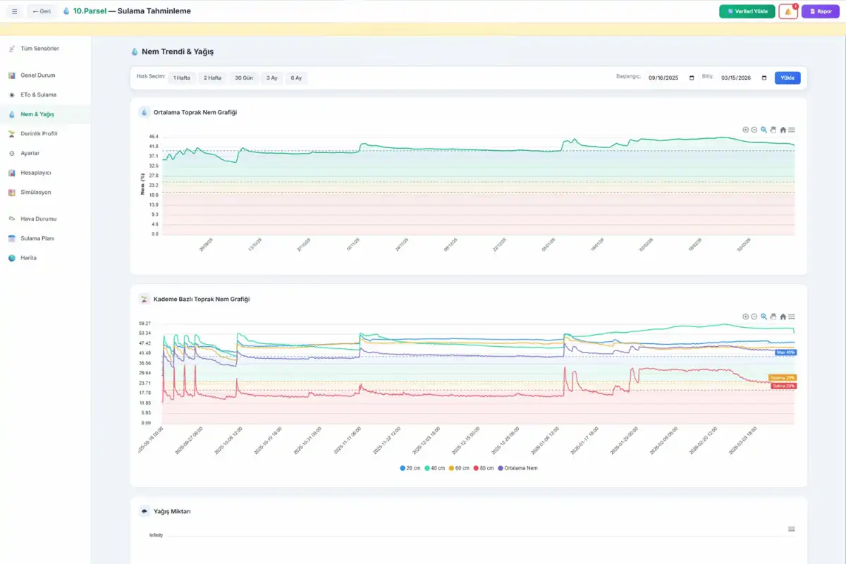 - Çoklu Derinlik Nem Sensörleri: 30, 60, 90 ve 120 cm derinliklerden gelen veriler, suyun toprak profilindeki hareketini izler. Yüzey kuru olsa bile derinlerdeki nem miktarını görerek gereksiz sulamanın önüne geçer.