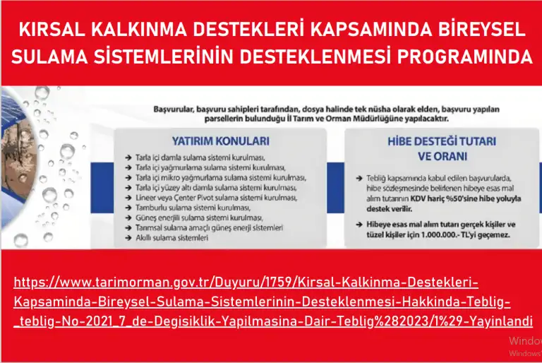 Gültig für die Jahre 2021-2025 ist beabsichtigt, die individuellen Bewässerungssysteme der Erzeuger im ländlichen Raum zu fördern. Ziel ist es, den Einsatz moderner, für landwirtschaftliche Tätigkeiten entwickelter, druckbetriebener individueller Bewässerungsmaschinen und -geräte durch die Erzeuger zu verbreiten. Investitionen in den folgenden Bereichen werden unterstützt: