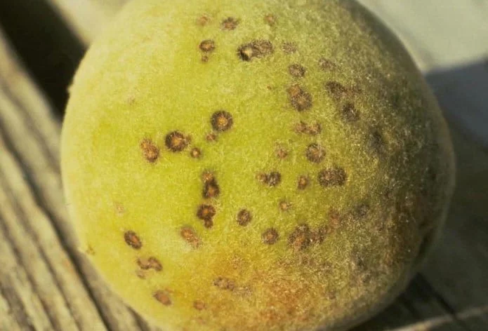 Round, powdery white fungal growth spots on fruit and leaves; rusty patches on fruits that turn brown and leathery and may crack.