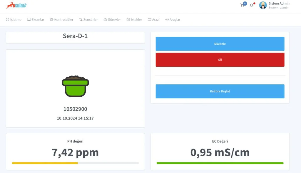 In the image, you see how one of our customers monitors and controls EC-pH sensor data through the application. The EC and pH sensors offered by Esular provide real-time data tracking to optimize agriculture and irrigation processes. Thanks to these sensors, users can easily monitor and control the conductivity (EC) and acidity (pH) levels of the water in the irrigation line directly through our mobile application.