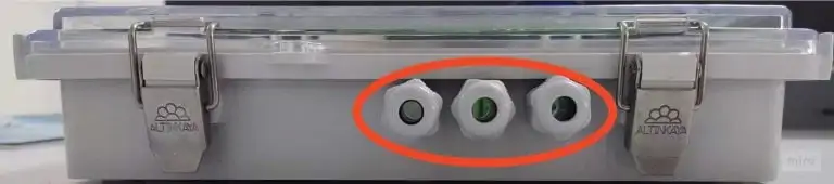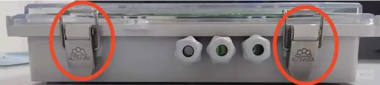 1. Kutu içine erişebilmek ve bağlantı yapabilmek için kırmızı daire içine alınmış olan metal klipsleri açmanız gerekmektedir ve klipsin kollarını dikkatlice dışa doğru çekerek veya yukarı doğru kaldırarak klipsi açın ama açarken dikkat edelim çünkü bu şekilde klips, kutunun kapağını serbest bırakacak ve içerideki cihaza erişim sağlanabilecektir. Klipsleri açtıktan sonra, kutunun kapağını yavaşça kaldırabilirsiniz. Böylece cihazın iç bileşenlerine ve bağlantı noktalarına erişim sağlamış olursunuz