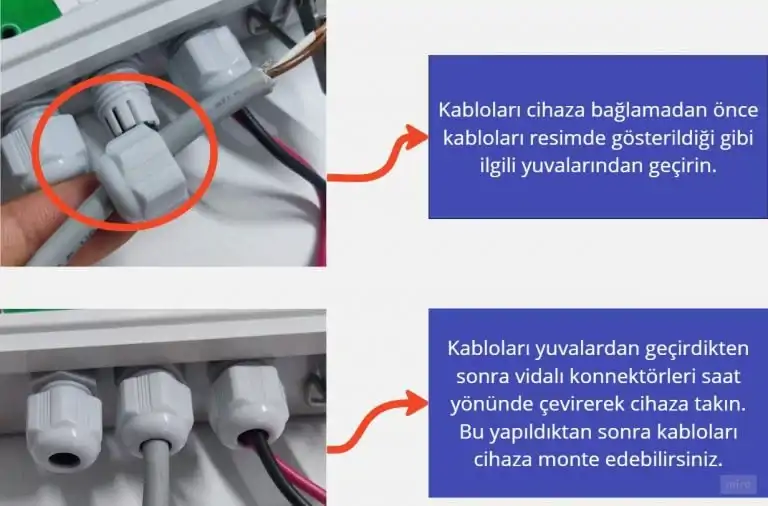 2. Kablolama yaparken, kabloları yukarıda kırmızı daire içinde gösterilen kablo yuvalarına doğru şekilde geçirmeye özen gösterin. İlgili bağlantı noktalarını ve kablo yuvalarını belirleyin. Bu noktalar genellikle cihaz üzerinde numaralandırılmış veya işaretlenmiş olabilir. Kabloları kablo yuvalarına doğru şekilde yerleştirin ve sıkıca bağlayın. Bağlantıların sağlam olması ve kablonun düzgün bir şekilde oturması önemlidir