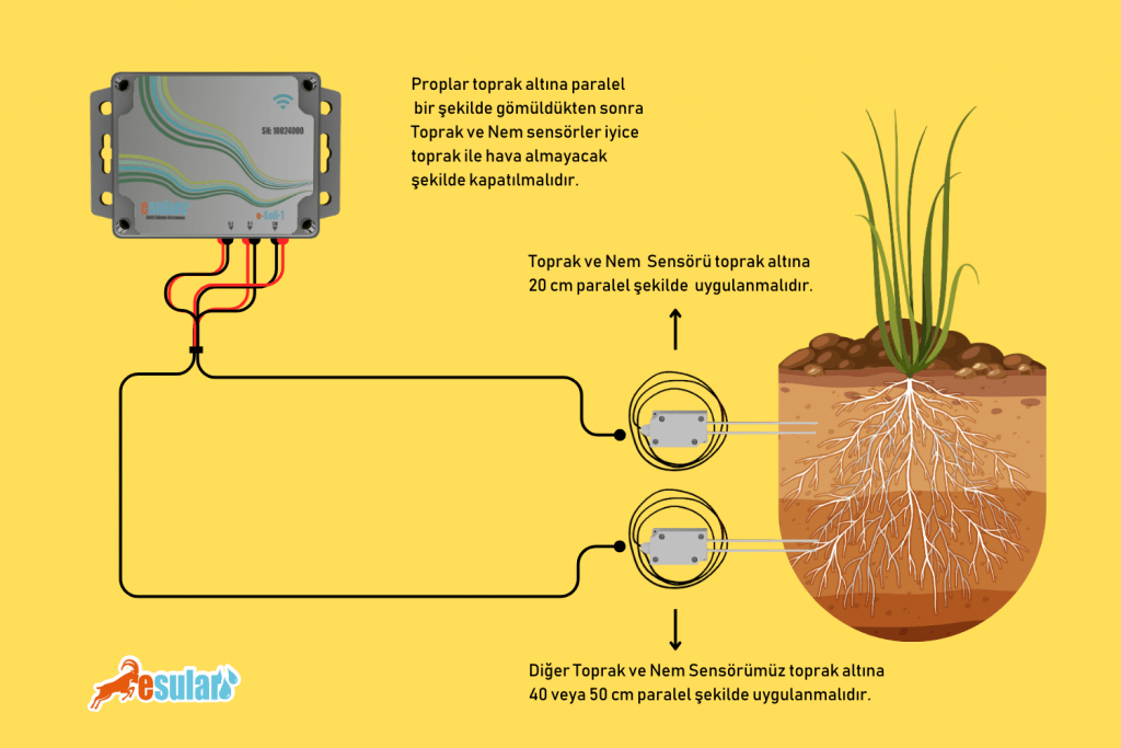 You can make the soil moisture sensor sent to you ready for use by connecting the red and black cables of the s1 s2 outputs on the device to the red and black cables on the probes, respectively. You should prevent oxidation and short circuits by well-protecting the connection points.